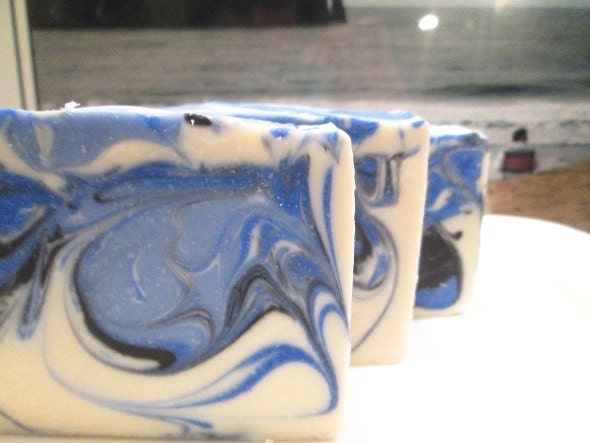This blue and white swirled handmade cold process soap is fragranced in an Aqua di Gio type fragrance oil. If you have not had the pleasure of smelling this unbelievable scent, you are missing out. A sexy, fresh, aquatic aroma scent. By far my most favorite man's fragrance!