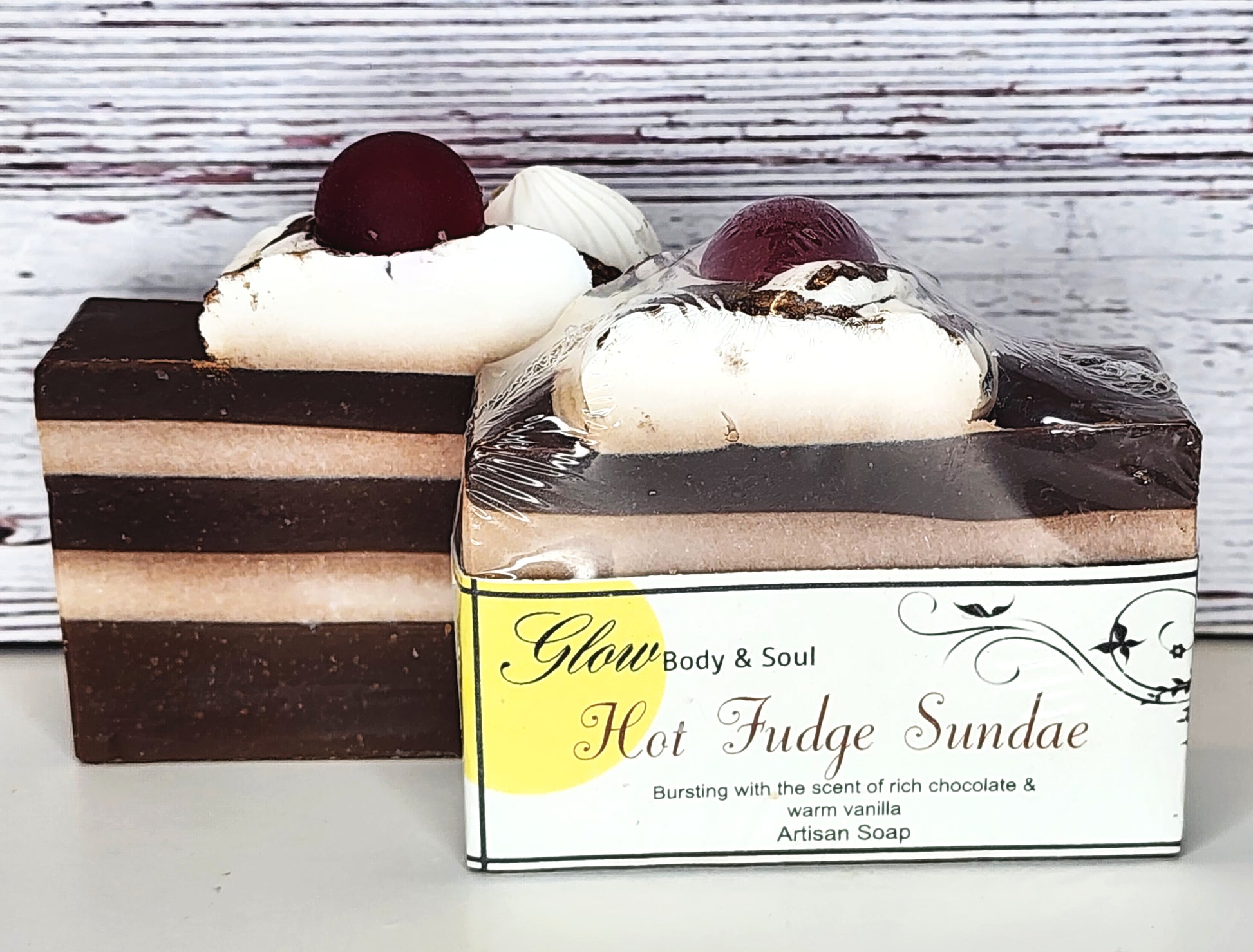 Fill your shower with the fabulous smell of a scrumptious hot fudge sundae! This scent is bursting with the smell of rich chocolate and warm vanilla. Chocolaty goodness with 0 calories! Great for those chocolate addicts in all of us. Made with layers of chocolate and vanilla colors topped with a glycerin soap 'cherry'.