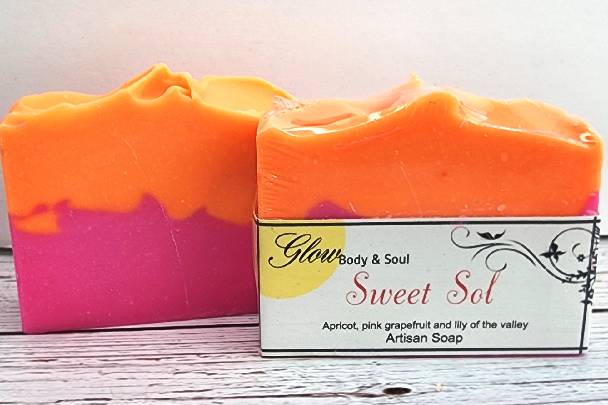Sweet Sol is the perfect blend of apricot, pink grapefruit and lily of the valley. Fresh, fruity, fantastic scent!!! This soap is vibrantly colored in hot pink and orange.