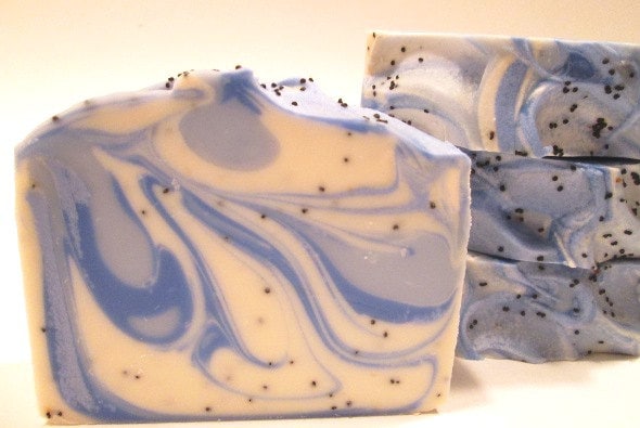 This vegan soap is colored with multi-colored blue swirls and added a touch of poppy seeds for light exfoliation.